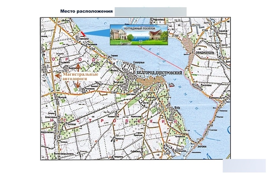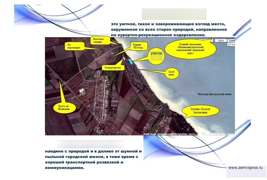 - Земельный участок расположен на побережье Днестровского лимана с выходом в Чёрное море в водоохранной и прибрежно-защитной полосе моря, отведённой и утверждённой под строительство гостинично-рекреационного комплекса или элитного коттеджного посёлка. Расстояние от берега до участка - 60 метров. Панорамный вид на лиман. Первая линия (и единственная) линия от лимана.