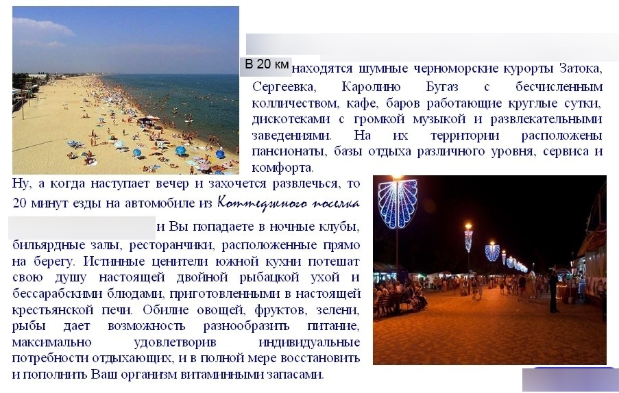 В 20 км от будущего гостиничного комплекса или коттеджного городка находятся знаменитые Черноморскиекурорты Затока, Сергеевка, каролина Бугаз с бесчисленными кафе, барами, работающими круглые сутки дискотеками с музыкой и развлекательными заведениями. На их территории расположены пансионаты, базы отдыха различного уровня, комфортным сервисом ночных клубов, бильярдных залов, ресторанчиков. Ценители южной кухни могут потешить себя бессарабскими блюдами, приготовленными в настоящей крестьянской печи. Обилие овощей, фруктов, зелени, рыбы даёт возможность удовлетворить индивидуальные потребности отдыхающих и в полной мере восстановить и пополнить организм витаминными запасами.