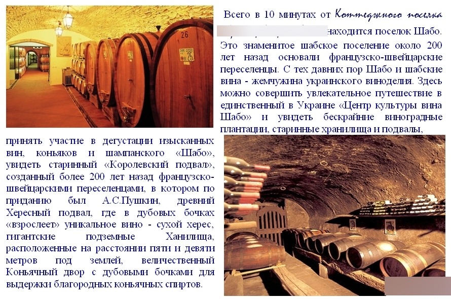 Всего в 10 минутах от будущего гостиничного комплекса или коттеджного городка находится посёлок Шабо. Это удивительное шабское поселение около 200 лет назад основали французско-швейцарские переселенцы. С тех давних времён Шабо и шабские вина стали жемчужиной украинского виноделия. Здесь можно совершить увлекательное путешествие в единственный в Украине "Центр культуры вина "Шабо" и увидеть бескрайние виноградники и плантации, старинные хранилища и подвалы, принять участие в дегустации изысканных коньяков и шампанского "Шабо". посетить старинный "Королевский подвал", основанный французско-швейцарскими переселенцами, в котором, по преданию, был А.С. Пушкин. В этом подвале в дубовых бочках "зреет" уникальное вино - сухой херес. В подземных хранилищах на глубине 5-9 метров находится величественный двор с дубовыми бочками для благородных коньячных спиртов.