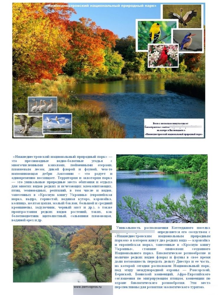 Уникальность расположения земельного участка для будущего грстинично-рекреационного комплекса или коттеджного городка заключается и в соседстве с "Нижнеднестровским Национальным парком". Парк представляет собой пресноводные водно-болотные угодья с многочисленными каналами, пойменными озёрами, плавневым лесом, дикой флорой и фауной, всё вместе напоминающими дебри Амазонии.