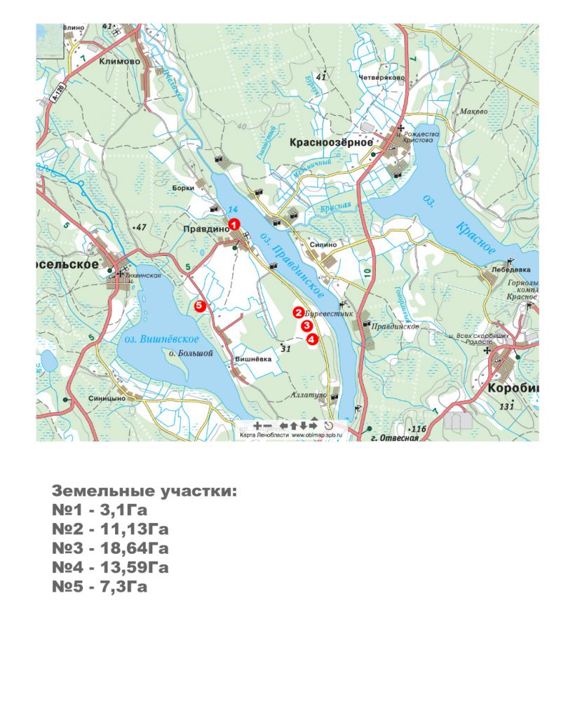 Земельные участки площадью 11.13 га, 18.64 га, 13.59 га, 7.3 га на 1-ой линии и вблизи Правдинского озера у посёлка Правдино .