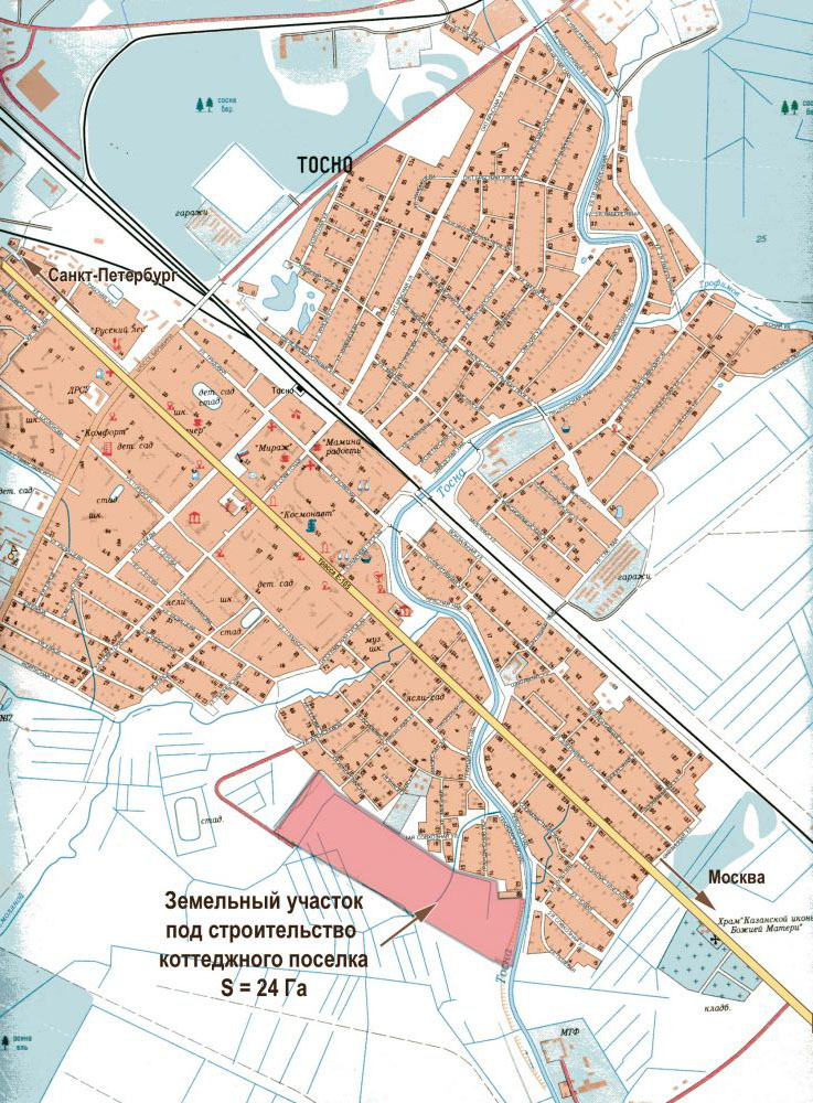 - Участок вплотную примыкает к городской квартальной застройке г. Тосно, состоящей из частных малоэтажных домов коттеджного типа.