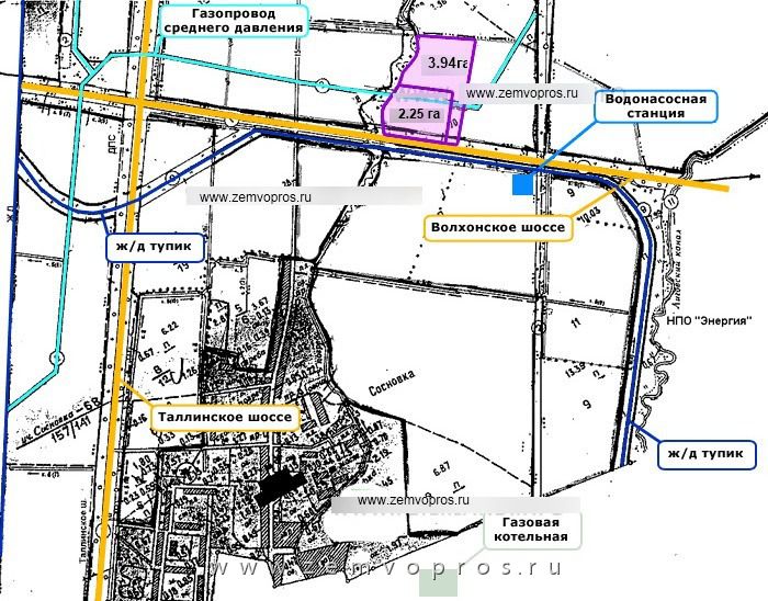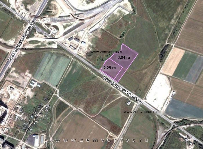 Два смежных земельных участка площадью 2.25 га и 3.94 га под размещение объектов: логистический комплекс, центр по продаже и обслуживанию автомобилей, торгово-развлекательный комплекс и др. на Волхонском шоссе в посёлке Горелово.