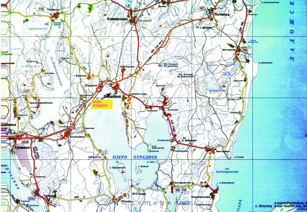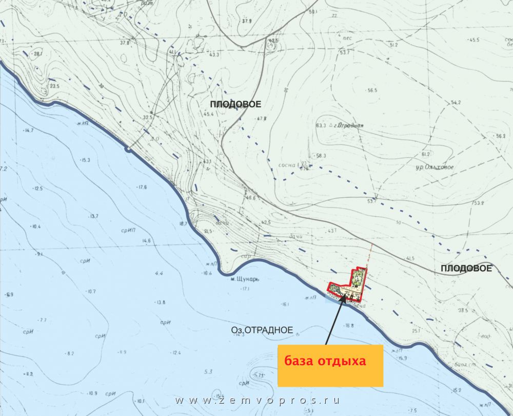 Действующая круглогодичная база отдыха на земельном участке площадью 14150 м2 на берегу озера Отрадное вблизи посёлка Плодовое.