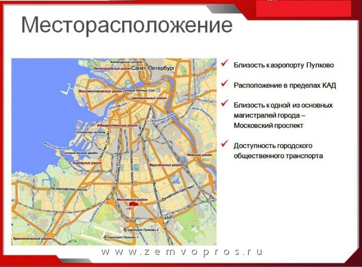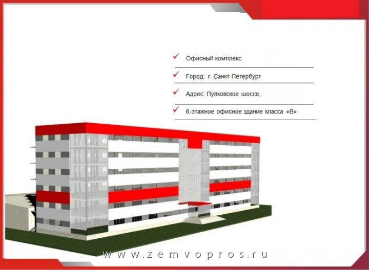 Бизнес-центр на земельном участке площадью 0.7 га на Пулковском шоссе в Московском районе Санкт-Петербурга.