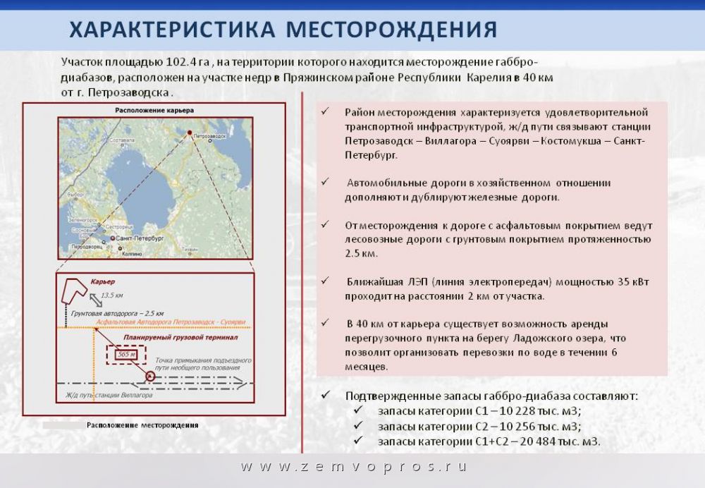 2. Хорошая транспортная доступность местрождения - наличие подъездных путей и ж/д станции, расположенной в южной части Республики Карелия.