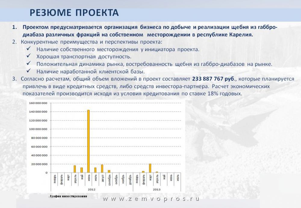 Строительство и эксплуатация предприятия - карьера по добыче высокопрочного щебня из габбро-диабаза на условиях соинвестирования (передачи доли в бизнесе) на земельном участке площадью 68.3 га в районе посёлка Кутижма.