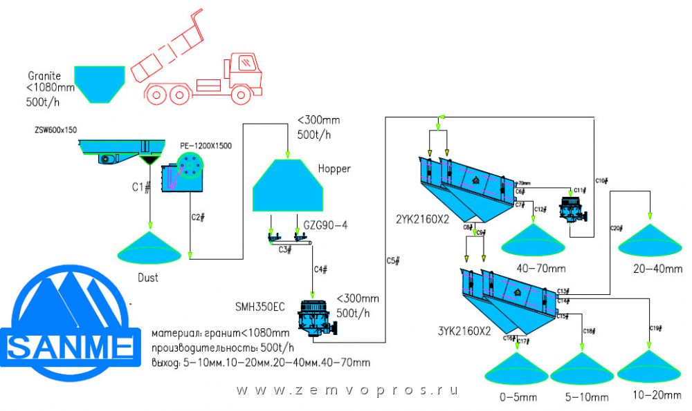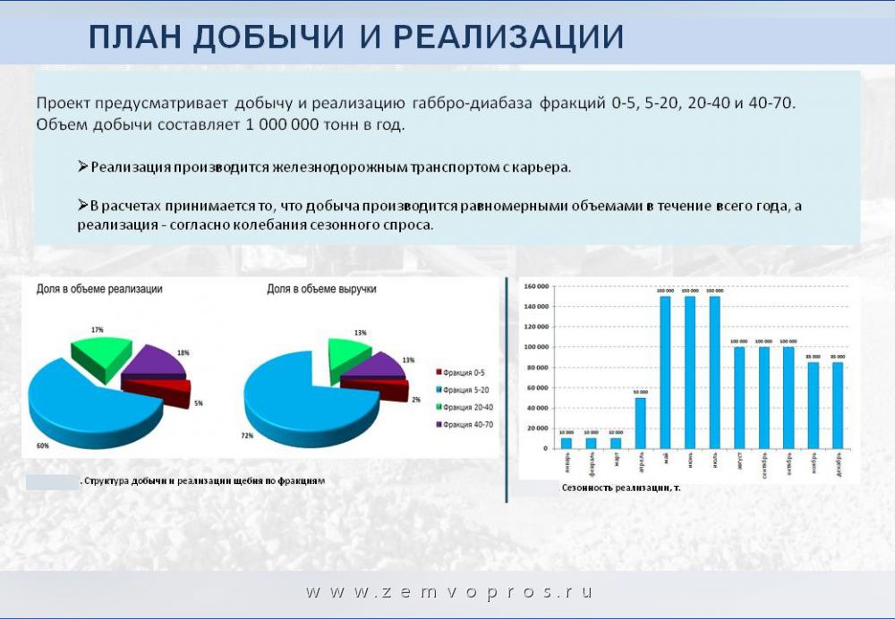 3. Отгрузка готовой продукции - габбро-диабазов фракций 0-5, 5-20, 20-40, 40-70 с объёмом добычи 1 млн. тонн/год в соответствии с этапами развития проекта :