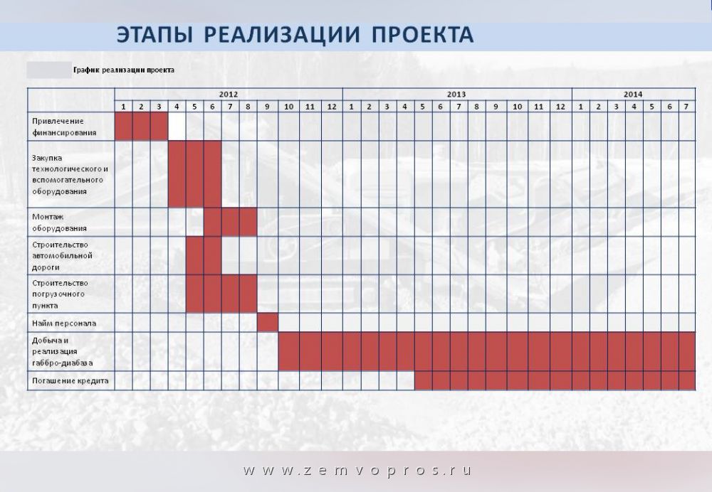 Срок реализации проекта (выход на проектную мощность) - 15 месяцев с момента начала финансирования