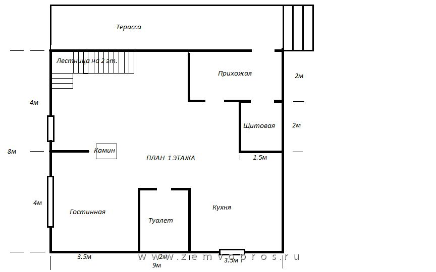 Дом . Новый. 2 этажа + цокольный этаж ( высота 3 м). Площадь 8 м х 9 м.