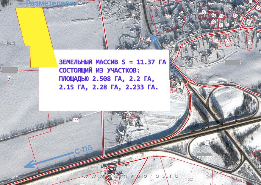Земельные участки площадью 2.508 га, 2.2 га, 2.15 га, 2.28 га и 2.233 га для жилищного строительства в поселке Разметелево.