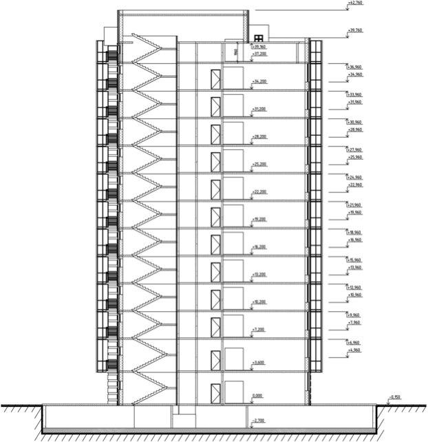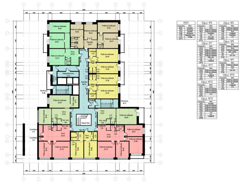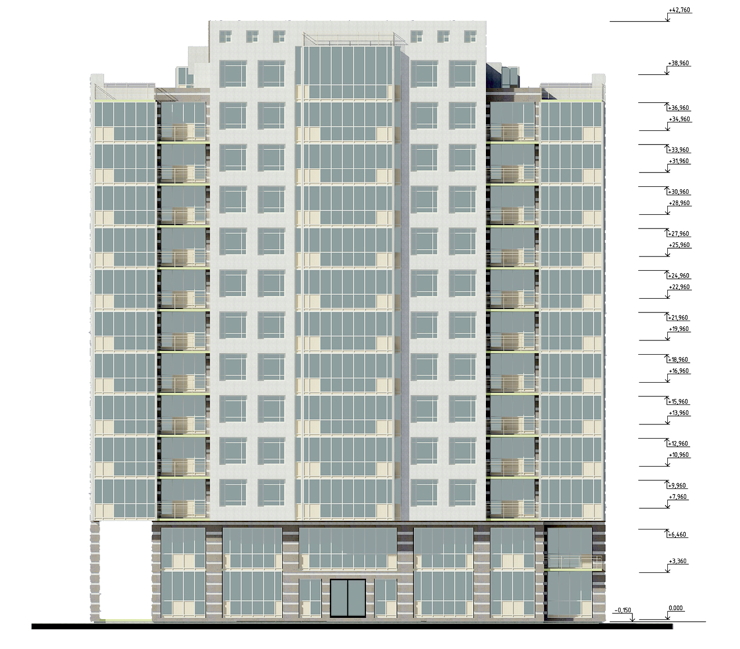 Проектируемый дом представляет собой 13-тиэтажное (с учетом технического чердака) жилое здание со встроенными помещениями административного назначения и подземной автостоянкой на 43 машиноместа. На первом этаже предполагается разместить входную группу жилого здания и помещения офисного назначения, на втором этаже - также размещаются офисные помещения, а на остальных этажах - жилые квартиры.