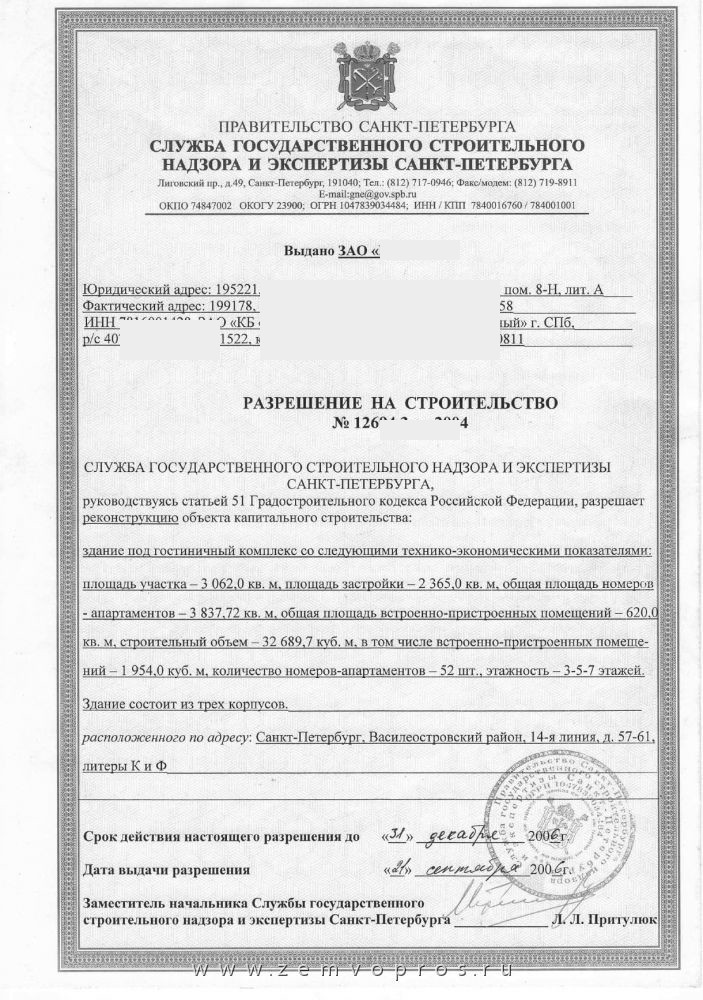 Реконструкция незавершённого строительства здания под гостиничный комплекс (жилой дом с квартирами-апартаментами) с разрешением на строительство на земельном участке площадью 3062.0 м2 на 13-я линии, д. 50, В.О.