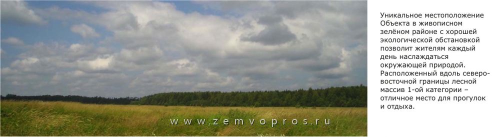 Уникальное местоположение участков в живописном зелёном районе с хорошей экологической обстановкой.