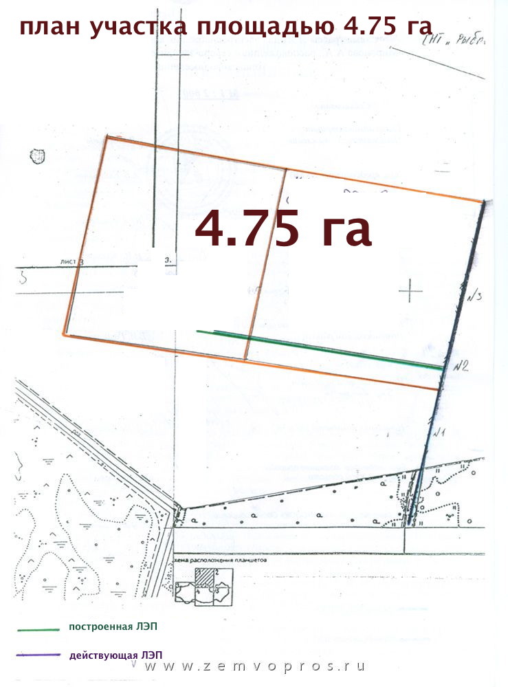- Участок общей площадью 4.75 га прямоугольной формы. Ровный. Не разработан. Частично закустарен.