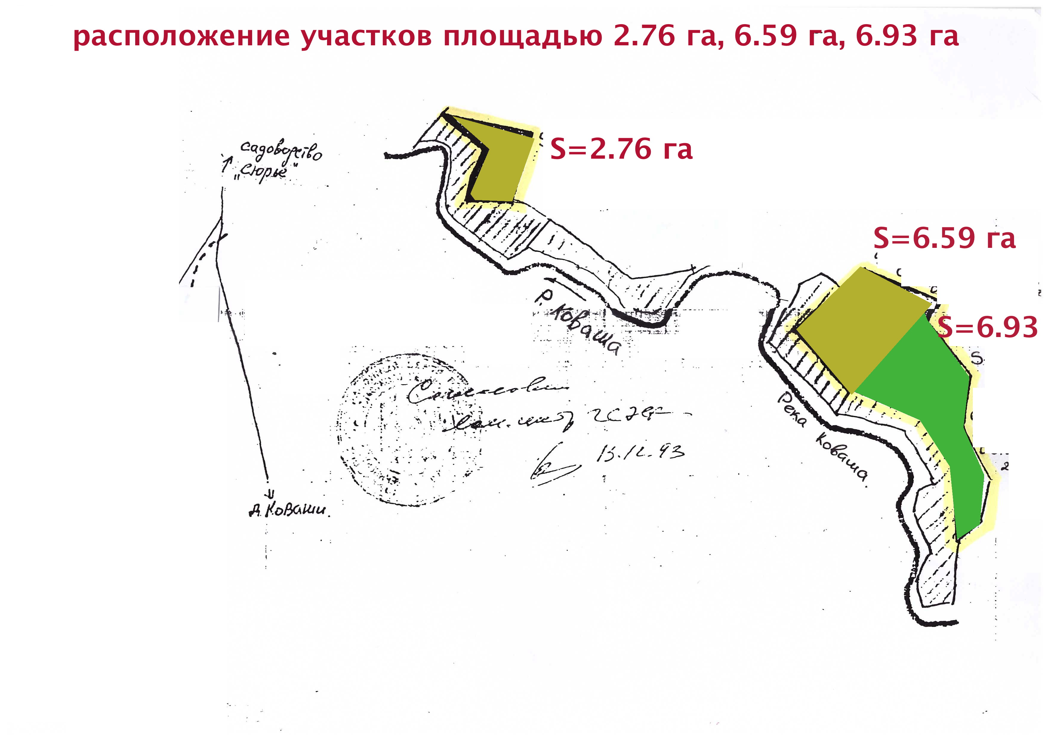 Земельные участки площадью 4.75 га, 6.93 га, 6.59 га, 2.76 га для ведения крестьянского хозяйства (КХ) на берегу реки Коваш возле деревни Коваши.