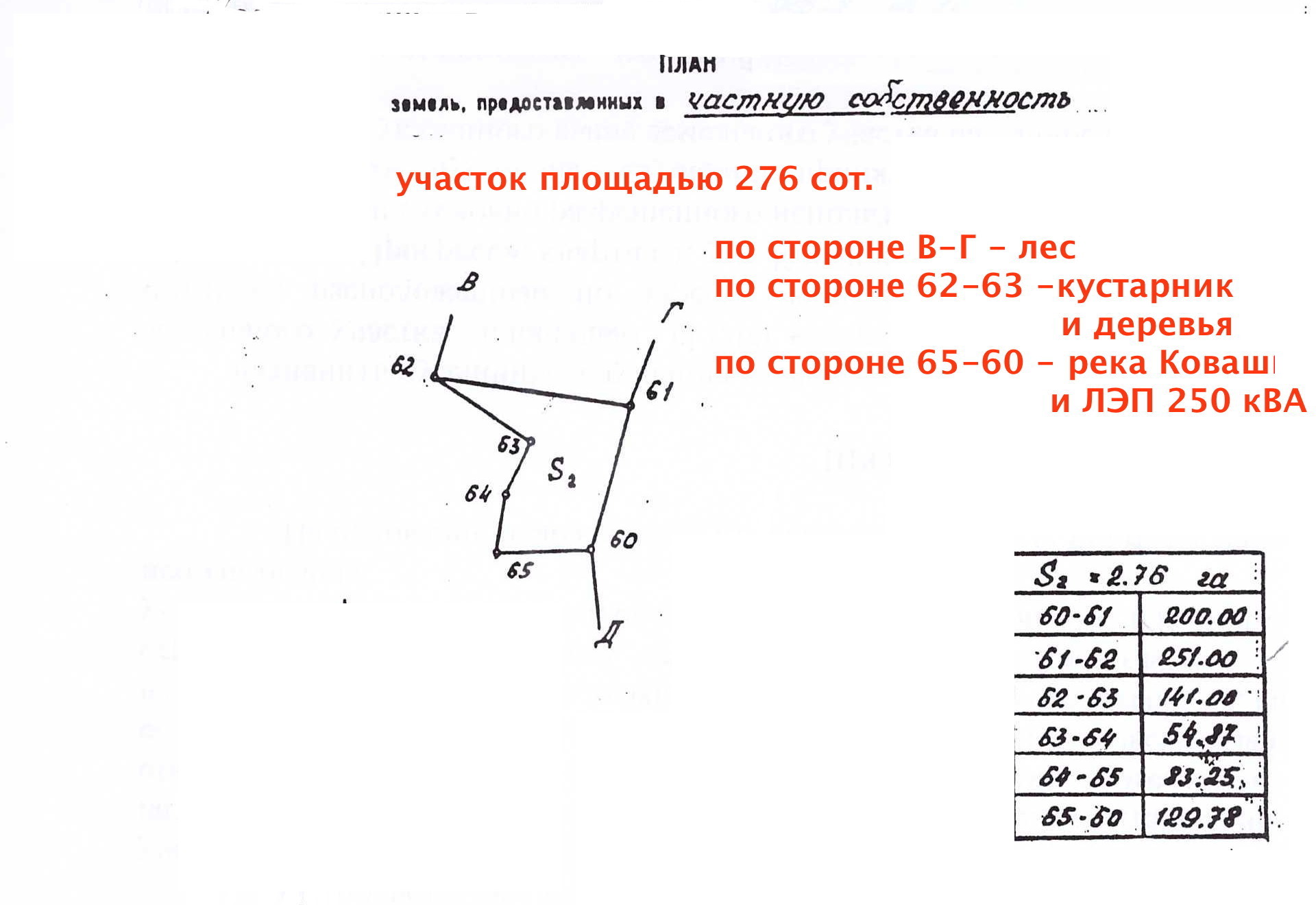 Сторона 65-60 - река Коваш (50 метров от границы участка).