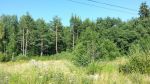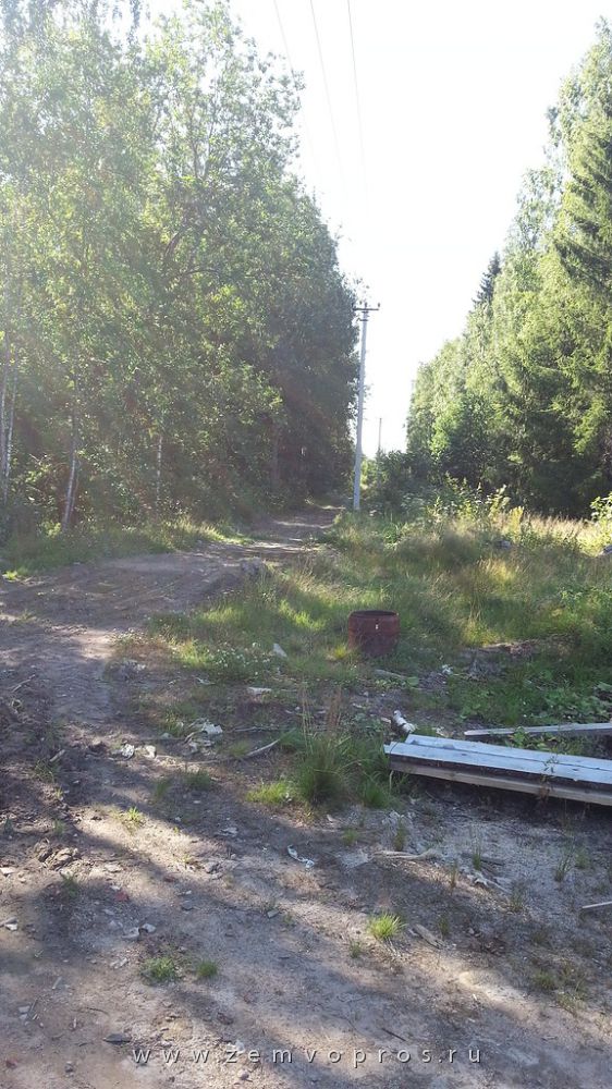 Одна сторона участка примыкает к грунтовой дороге, идущей через лес, к участку, требующему ремонта. По кромке участка - хвойные деревья и кустарник.