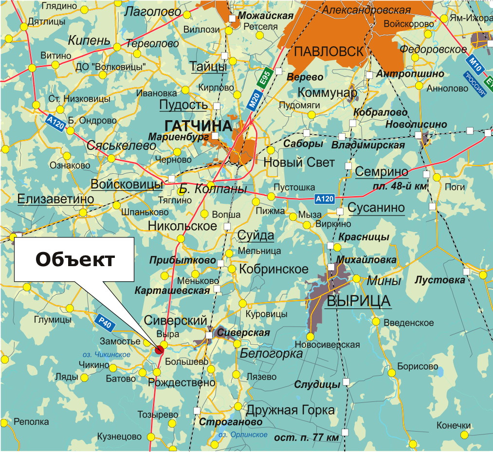 - Основной маршрут движения проходит по Федеральной автомобильной дороге М20 «Санкт-Петербург - Псков», являющейся частью европейского маршрута Е95 (55 км от КАД).