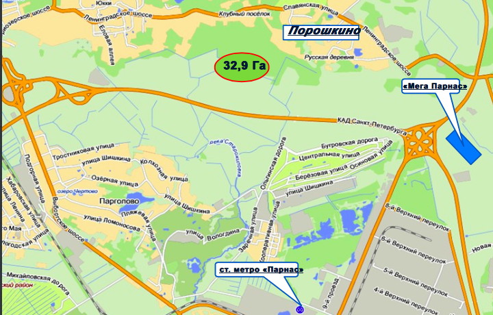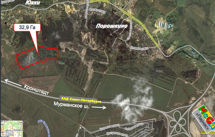 Земельный участок площадь 329 600 м2 (32.9 га) для малоэтажного жилищного строительства в черте посёлка Порошкино.