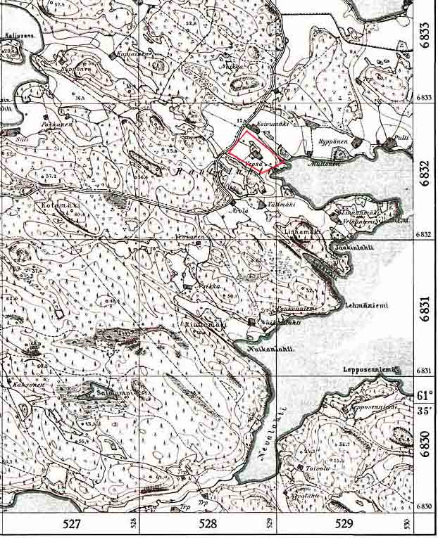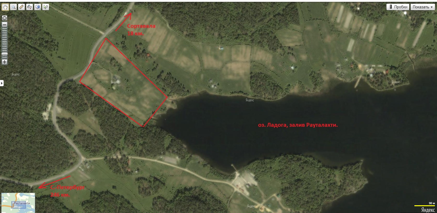 Земельный участок площадью 86 773 м2 (8.68 га) с жилым домом и хозяйственными постройками со своим выходом на берег залива Рауталахти Ладожского озера вблизи посёлка Рауталахти.