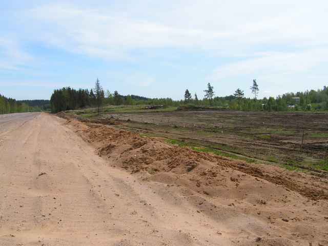 На участке выполнены подготовительные работы: проводка дренажной система (отвод грунтовых вод) и подсыпка грунта по всему участку до уровня автомагистрали).