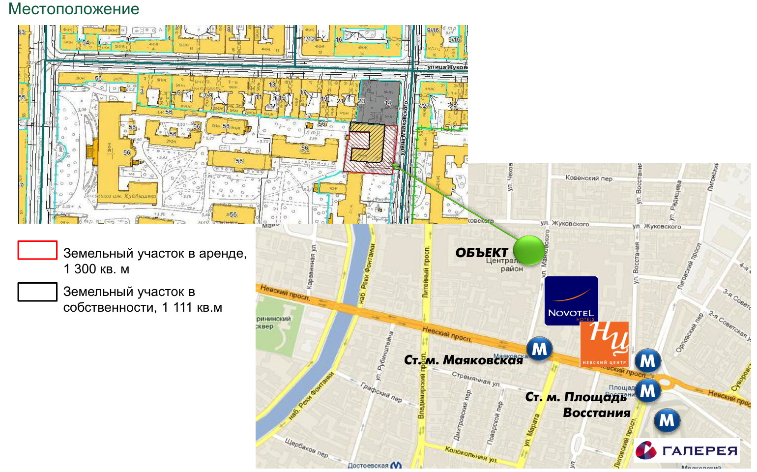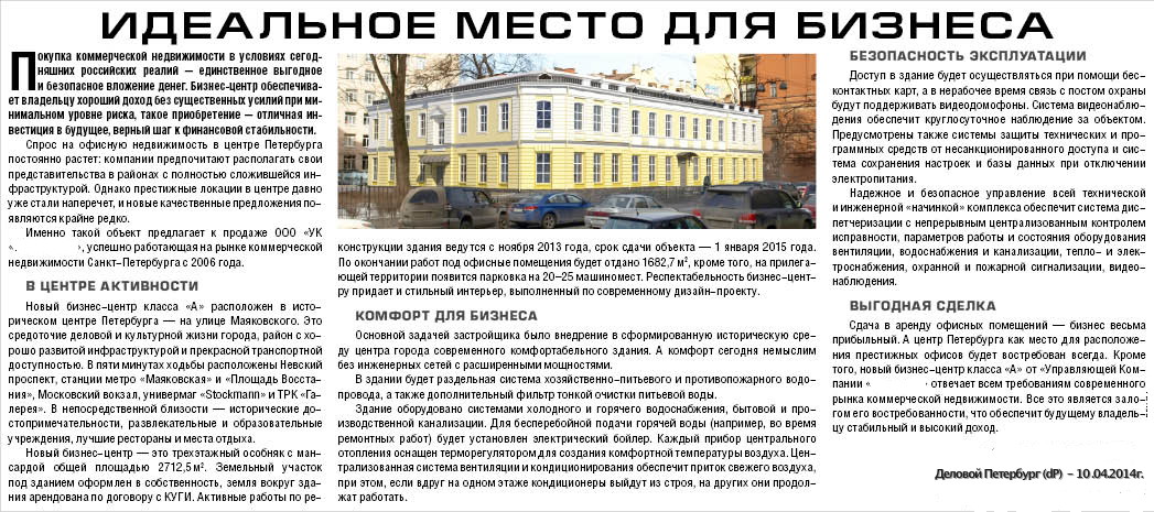 - Объект имеет удачное местоположение в хорошо развитой части города, в центре деловой и культурной жизни Санкт-Петербурга на ул. Маяковского, д. 12, лит. П.