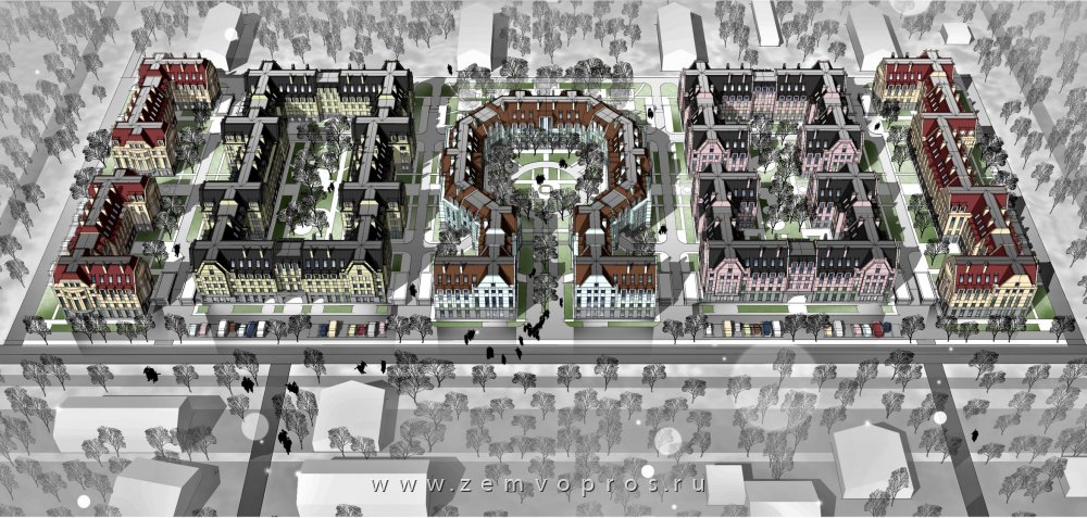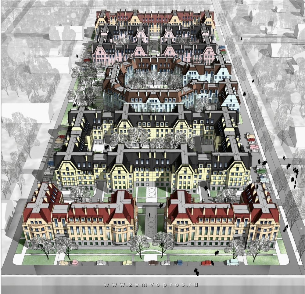 Проектируемый комплекс представляет собой единую структуру четырехэтажных жилых секций с пятым мансардным этажом, образующих систему внутренних дворов с цветниками и игровыми площадками. В проекте предусматривается подземный двухуровневый паркинг.